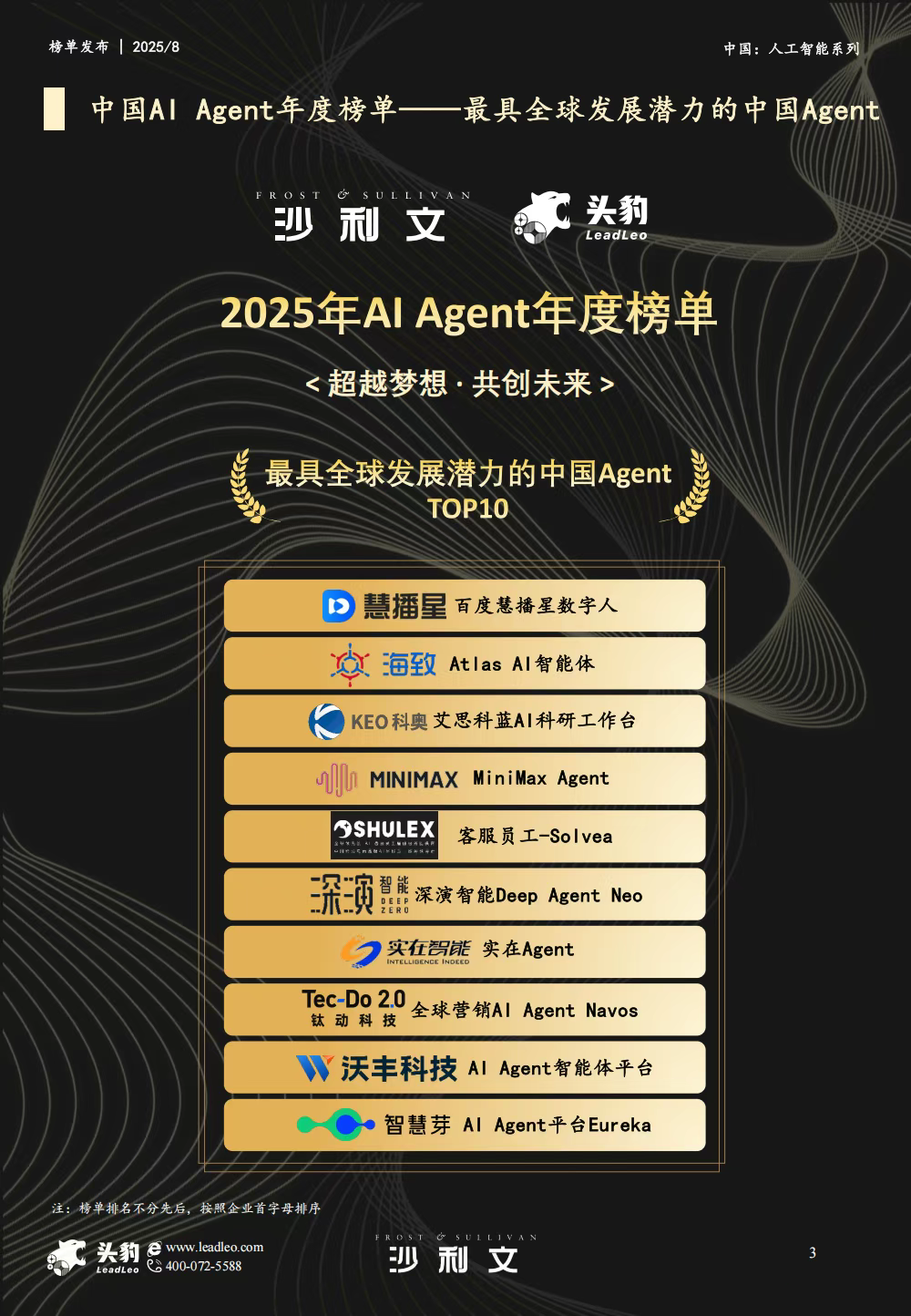 8月28日,全球知名咨询机构沙利文联合头豹研究院发布了《2025年中国AI Agent(智能体)最佳实践应用榜单》,凭借自主研发的 AI 智能体平台 Deep Agent Neo 的突出实力,Z6尊龙·凯时智能从 150 家参评企业、近 300 个产品 / 解决方案中脱颖而出,成功入选 “最具全球发展潜力的中国 Agent” TOP10 榜单,再度印证其在 AI Agent 领域的技术硬实力与全球化发展潜力。